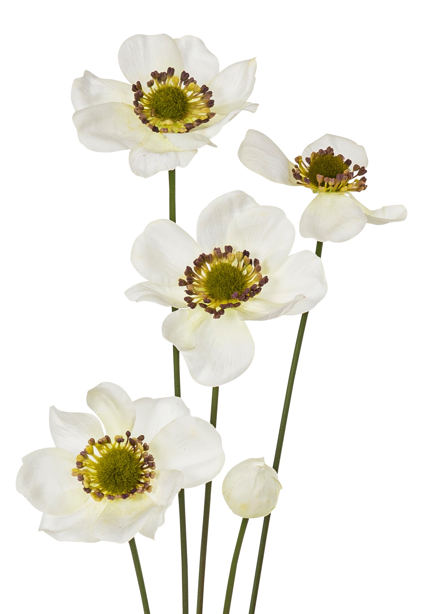 Der künstliche Anemonenzweig mit vier Blüten und einer Knospe hat eine Länge von 73cm, einen Blütendurchmesser von ca. 8cm und ist durch seine anmutigen Blütenblätter in Weiß ein Blickfang in jedem Raum.