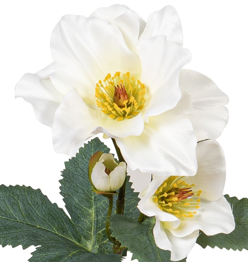 Die künstliche Christrose mit zwei Blüten und einer Knospe hat einen Blütenkopfdurchmesser von ca. 2/8/13cm . Sie wurde mit großer Detailtreue der echten Christrose nachempfunden und schafft mit ihrer Farbgebung eine zauberhafte Atmosphäre.