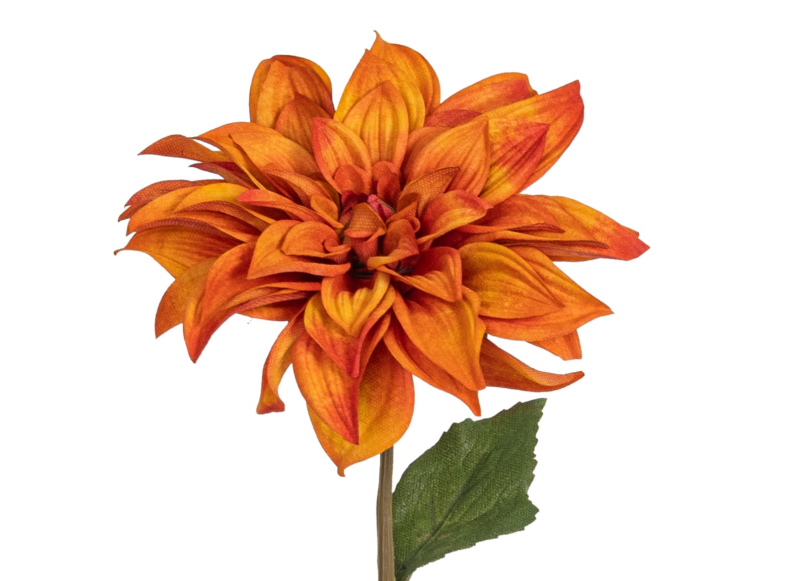 Die einzelne Dahlie RE in der Farbe Orange-Gelb ist 66cm lang, hat einen Blütenkopfdurchmesser von ca. 16cm und eignet sich hervorragend für Dekorationen im Innenbereich.