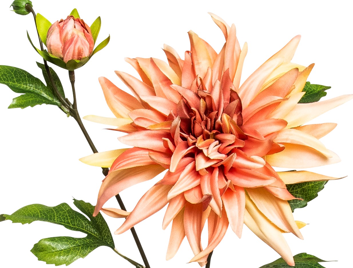 Erleben Sie die Schönheit und Anmut unserer künstlichen Dahlie mit Knospe mit einem Blütendurchmesser von ca. 15cm in einem zarten Lachston. Diese 63cm hohe Blume ist nicht nur ein optisches Highlight, sondern auch die ideale Wahl für alle, die den Charme frischer Blumen schätzen, jedoch wenig Zeit für deren Pflege haben.