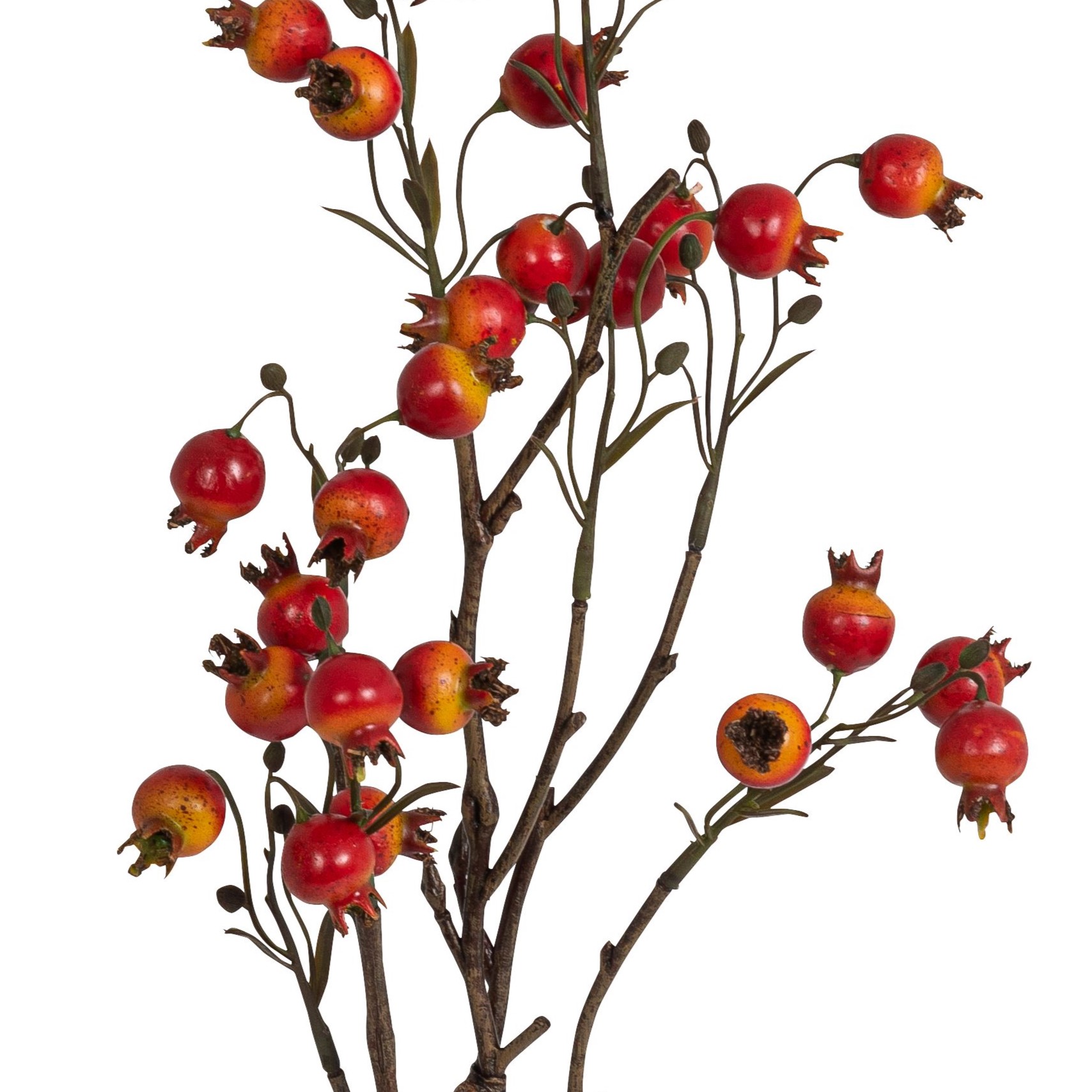 Künstliche Früchte- und Beerenzweige, wie unser 61cm langer Hagebuttenzweig in der Farbe orange-rot, sind unverzichtbare Elemente in der floralen Dekoration, wenn es um moderne Innenraumgestaltung geht.