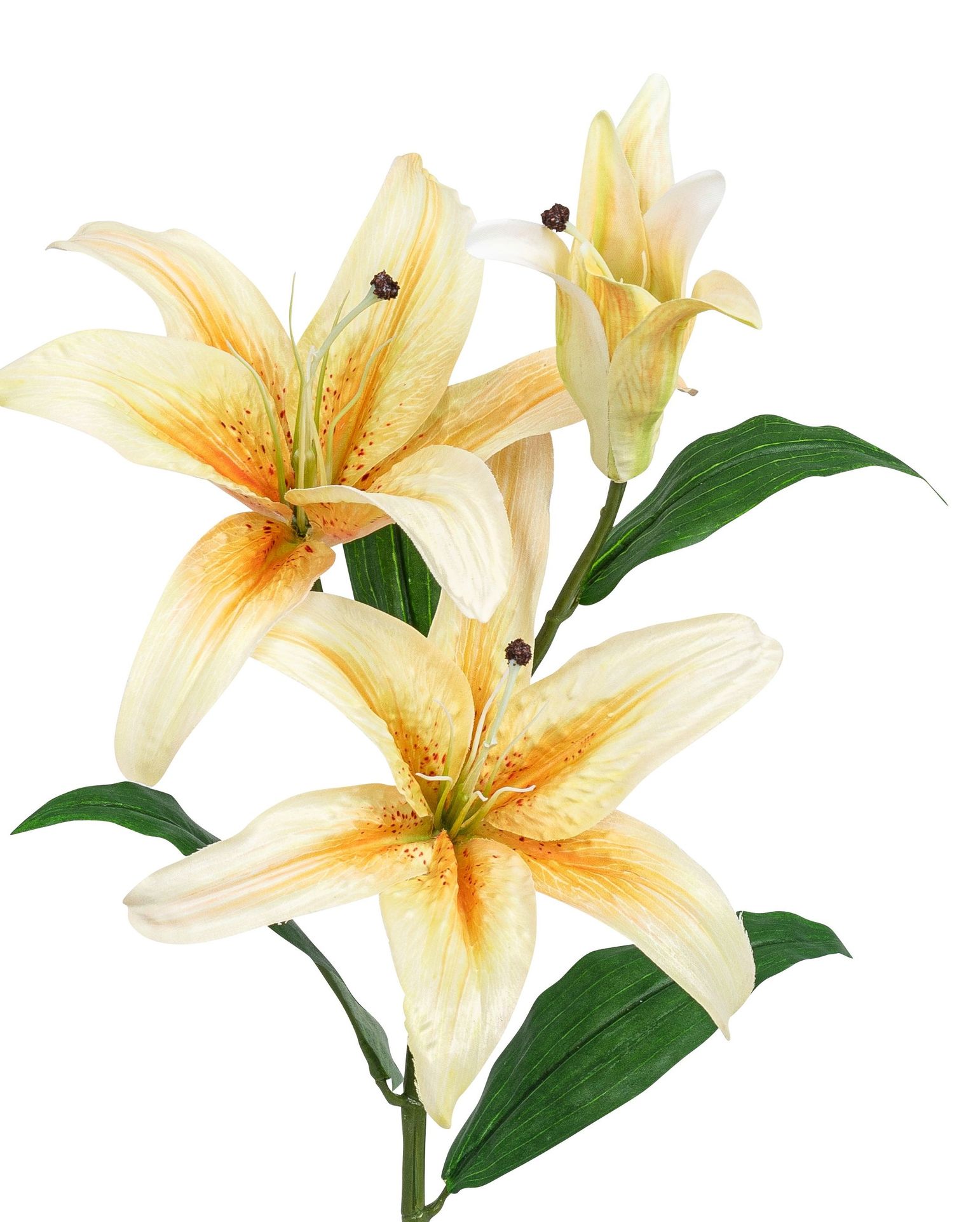 Der Lilienzweig RE mit 2 Blüten und einer Knospe in der Farbe Gelb ist 88cm lang und hat einen Blütenkopfdurchmesser von ca. 4/20cm.