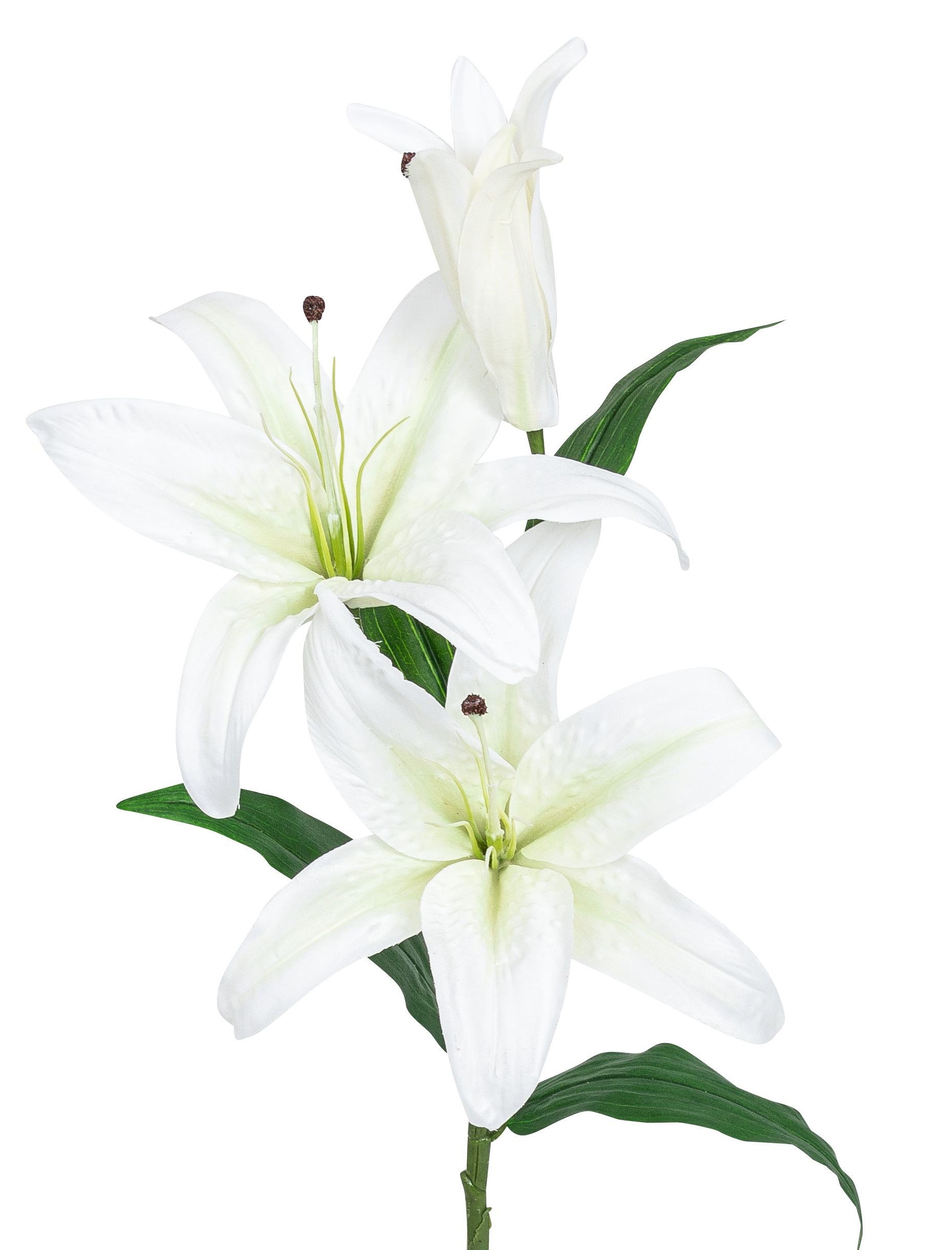 Der Lilienzweig RE mit 2 Blüten und einer Knospe in der Farbe Weiß-Grün ist 88cm lang und hat einen Blütenkopfdurchmesser von ca. 4/20cm.