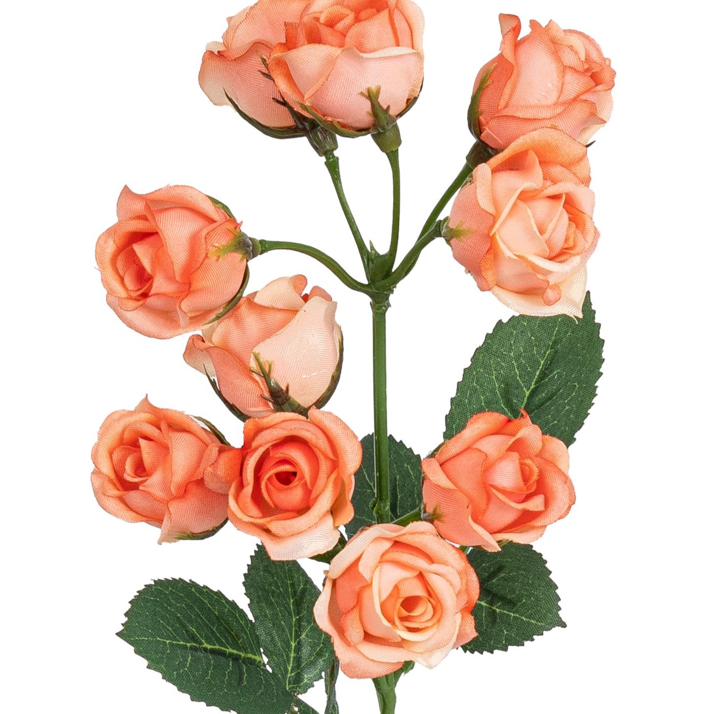 Der Minirosenzweig RE mit 10 Blütenköpfen in der Farbe Lachs ist 35cm lang und hat einen Blütenkopfdurchmesser von ca. 2cm.