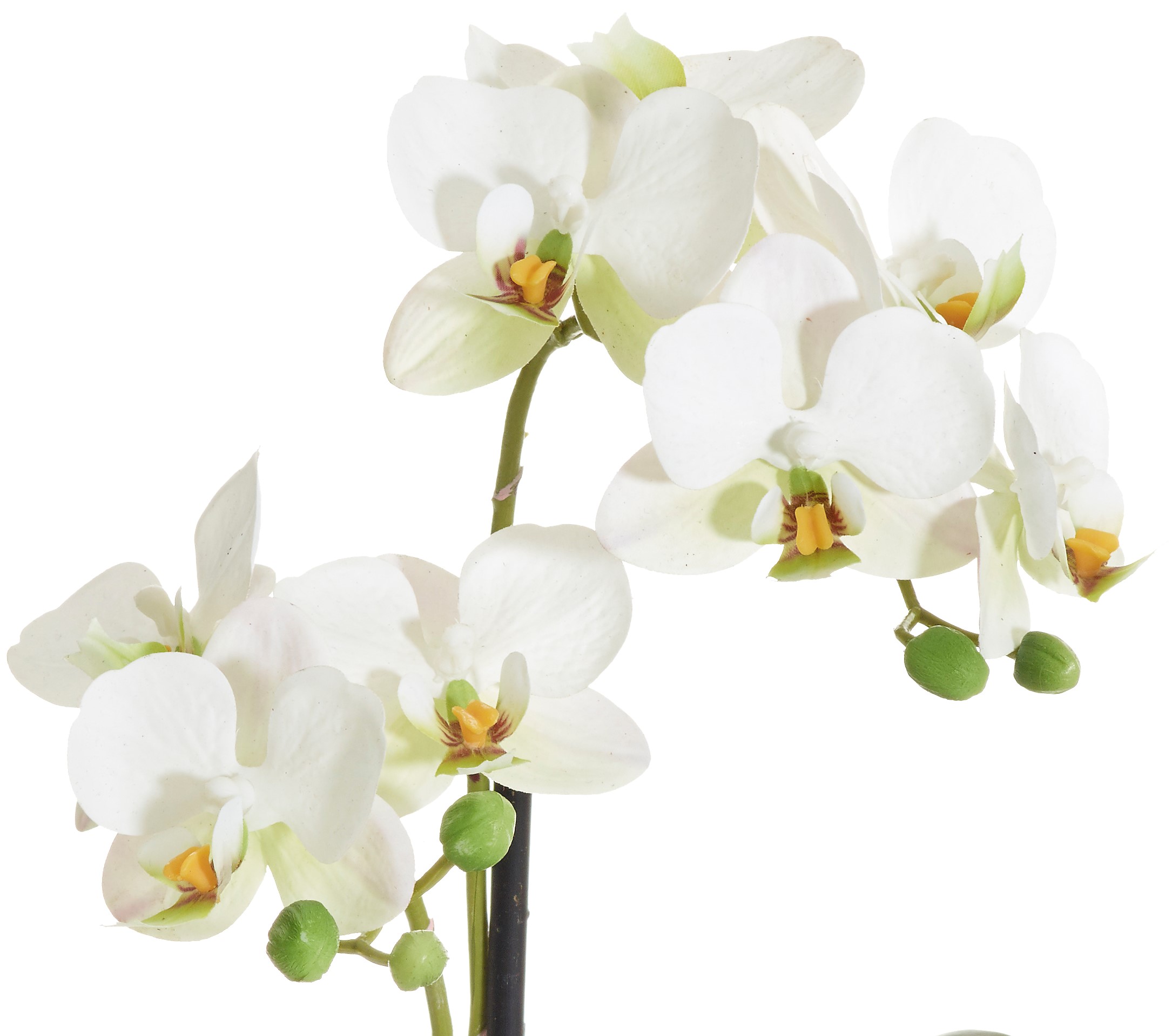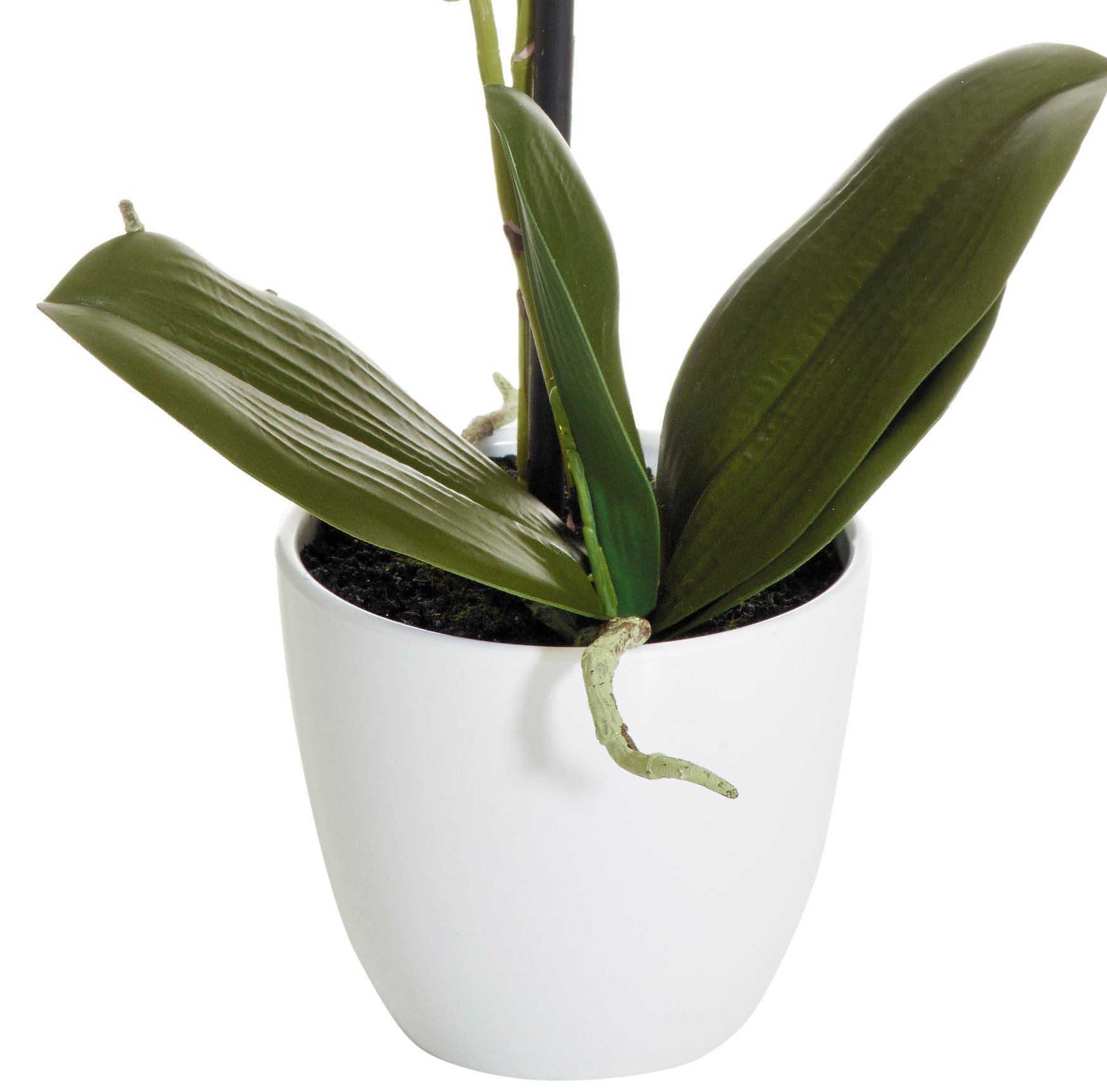 Die künstliche Phalaenopsis im Topf mit ihren zwei Blütenrispen sieht aus wie echt und vermittelt das Gefühl von frischen Blüten.