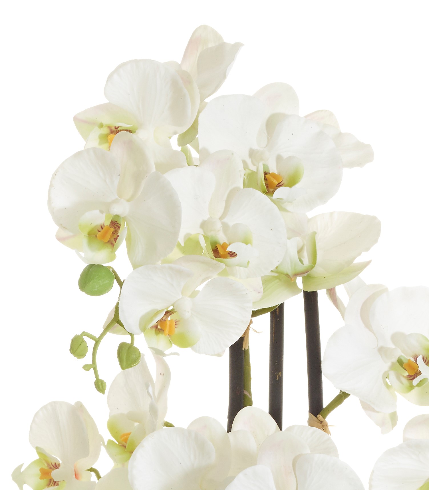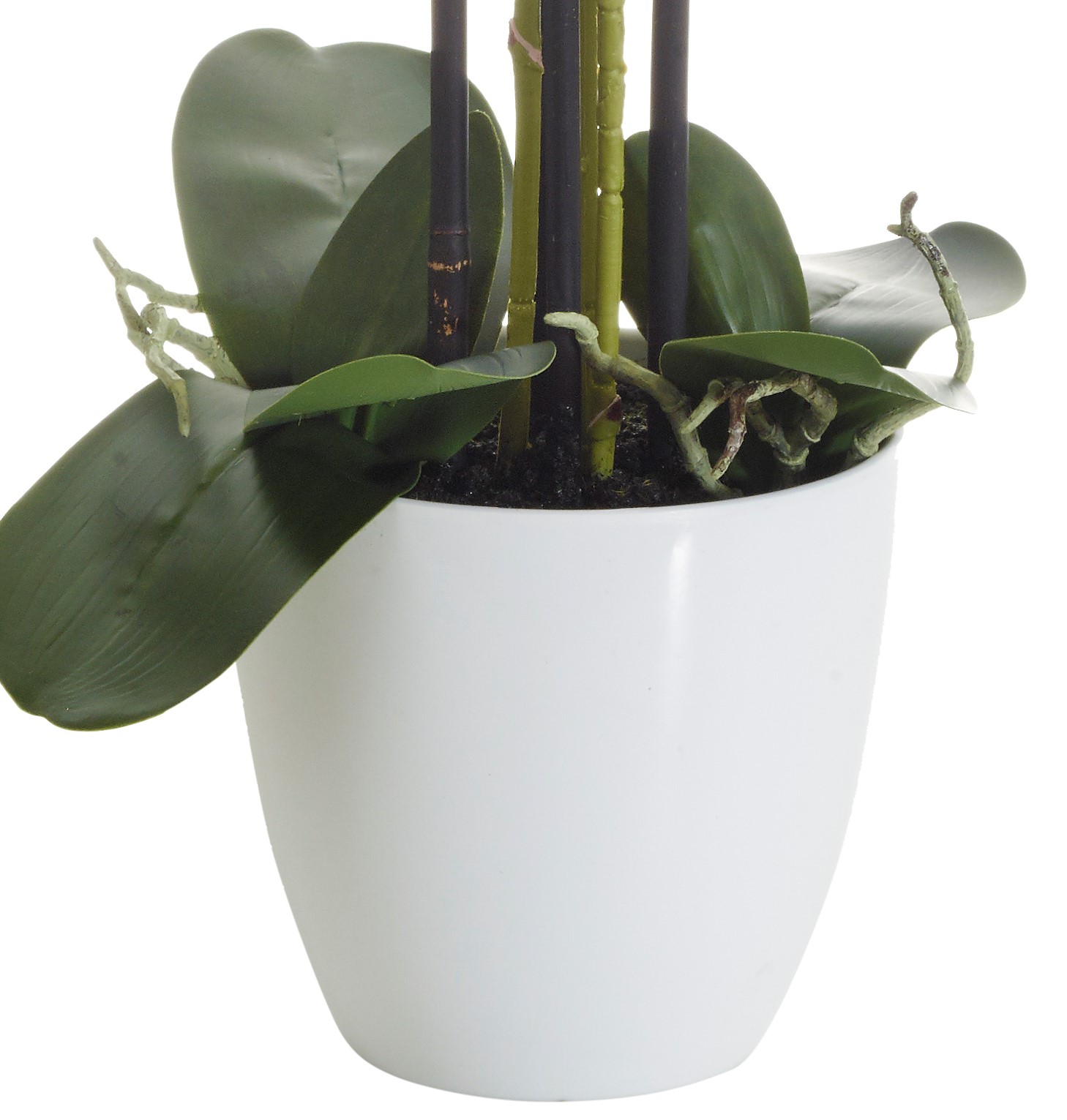 Die künstliche Phalaenopsis im Topf mit ihren vier Blütenrispen sieht aus wie echt und vermittelt das Gefühl von frischen Blüten.