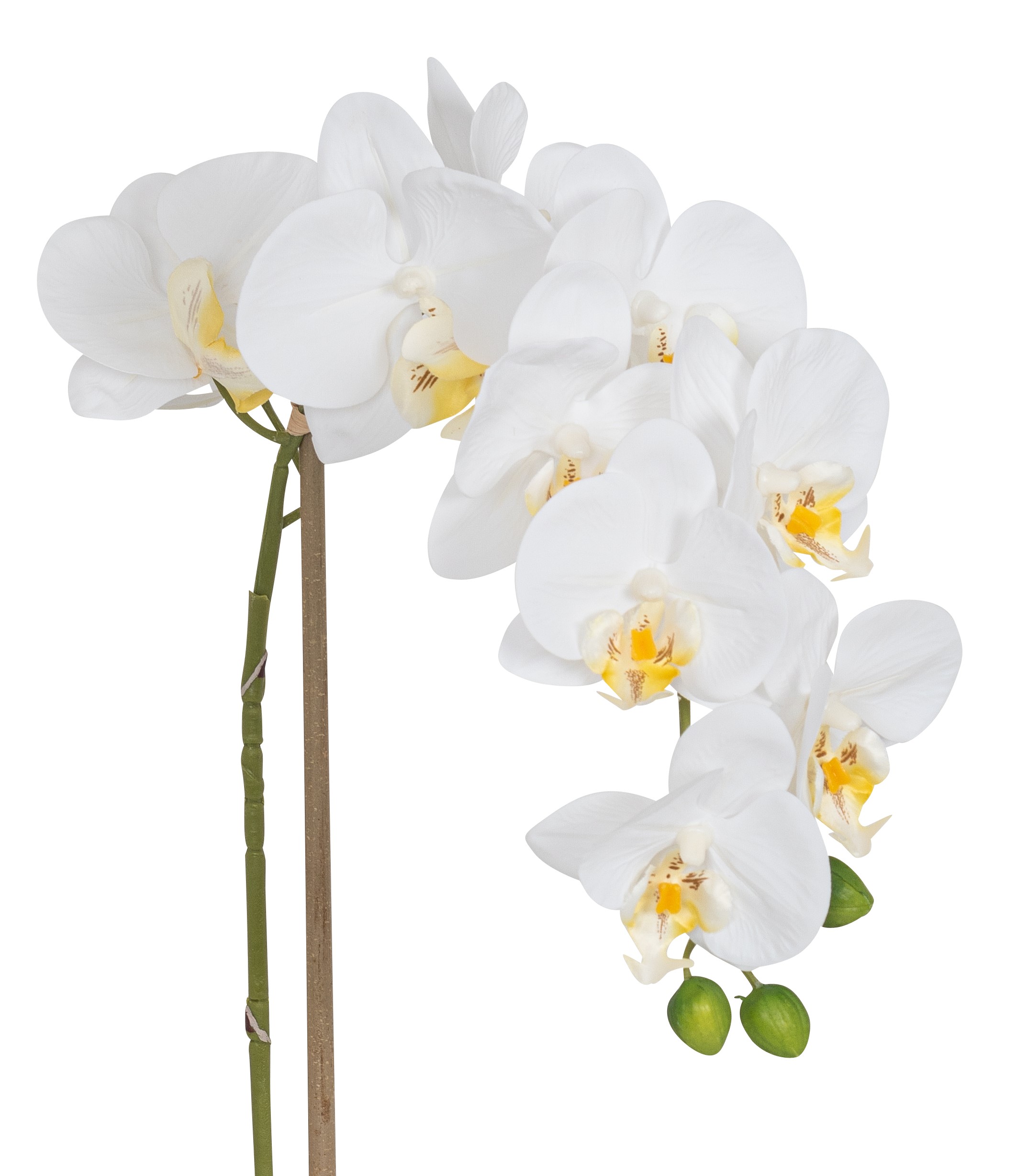 Phalaenopsis im Topf 58cm Blütenkopf Ø ca. 8/9cm Topf: Höhe ca. 10,0cm Ø oben ca. 11,0cm Ø unten ca. 6,5cm Farbe: weiß-gelb