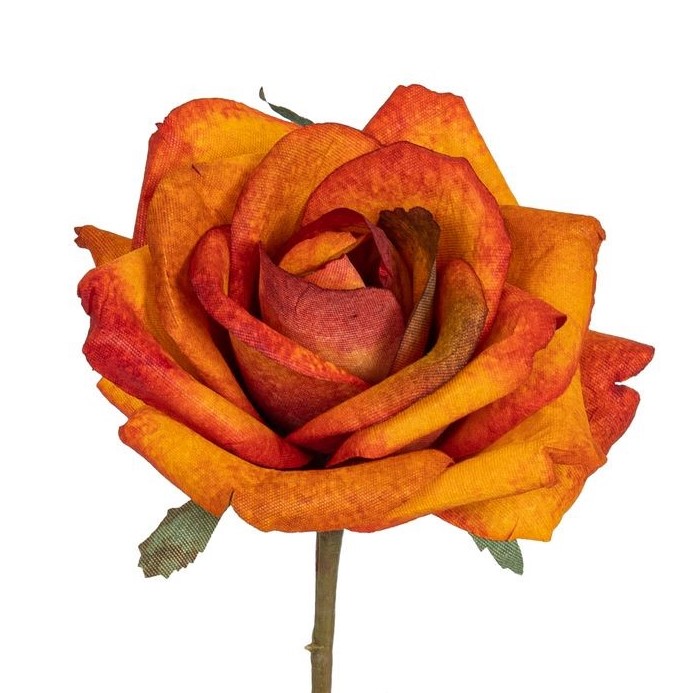 Die einzelne Rose RE in der Farbe Orange-Gelb ist 62cm lang, hat einen Blütenkopfdurchmesser von ca. 9cm und eignet sich hervorragend für Dekorationen im Innenbereich.