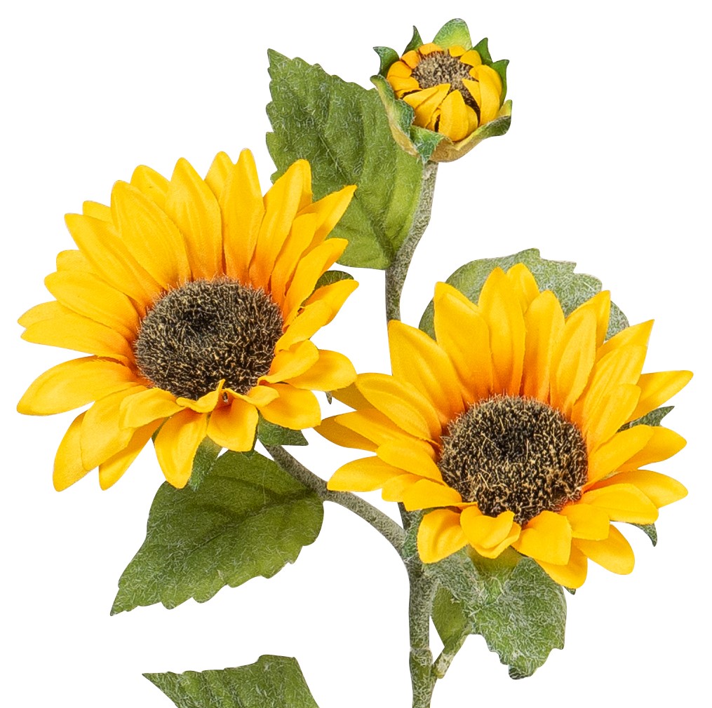 Die künstliche Sonnenblume mit zwei Blüten und einer Knospe in strahlendem Gelb ist 62cm lang und hat einen Blütenkopfdurchmesser von ca. 3 bis 10cm.